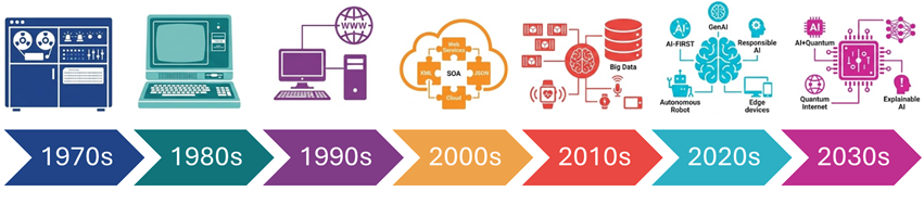 E se olharmos mais para trás, entre 1970 e 2025, cada década teve uma arquitetura de TI relevante assim como diferentes componentes de infraestrutura e elementos de software que formaram nossos projetos, aplicações, discussões, arquiteturas e sistemas. Tudo isso foi construindo as tecnologias seguintes, num verdadeiro carrossel de evolução continuada.